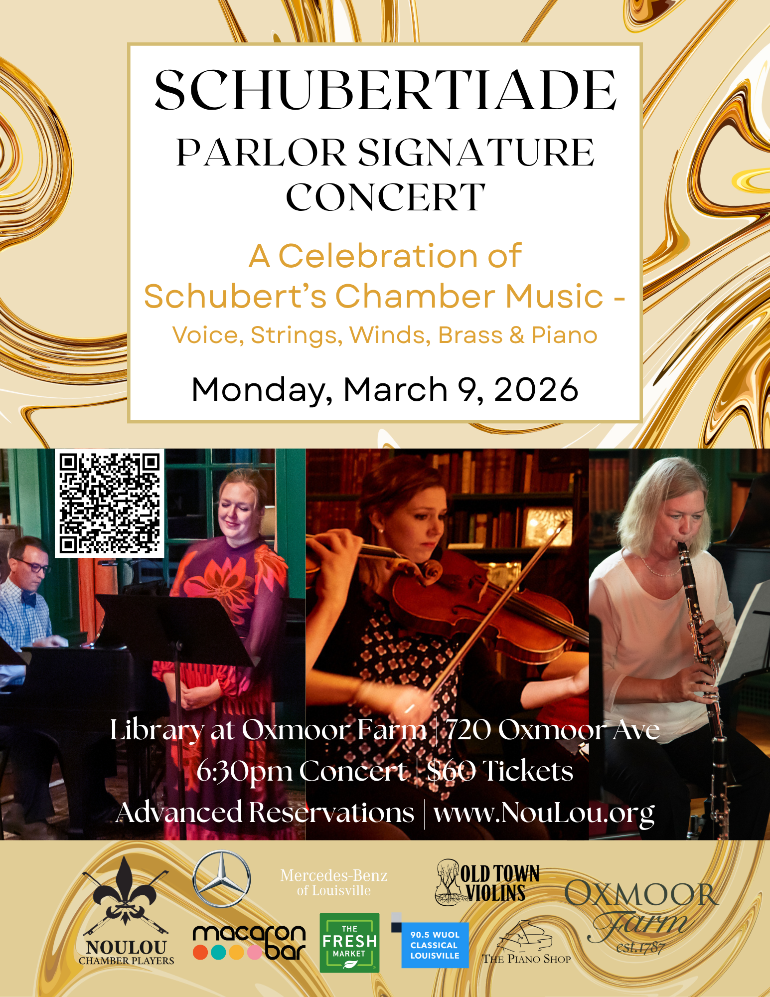 Celebrate NouLou Chamber Players’ 10th Season with Schubertiade, our Parlor Signature Concert, in the historic library at Oxmoor Farm. Enjoy a special pre-concert reception featuring handcrafted bourbon from Oxmoor Bourbon Company, then step into the spirit of a true Schubertiade—an intimate gathering filled with music, friendship, and joy—as our full ensemble brings Franz Schubert’s chamber works to life with voice, strings, winds, brass, and piano. Join us for an evening of timeless music and shared celebration in one of Louisville’s most charming settings.
