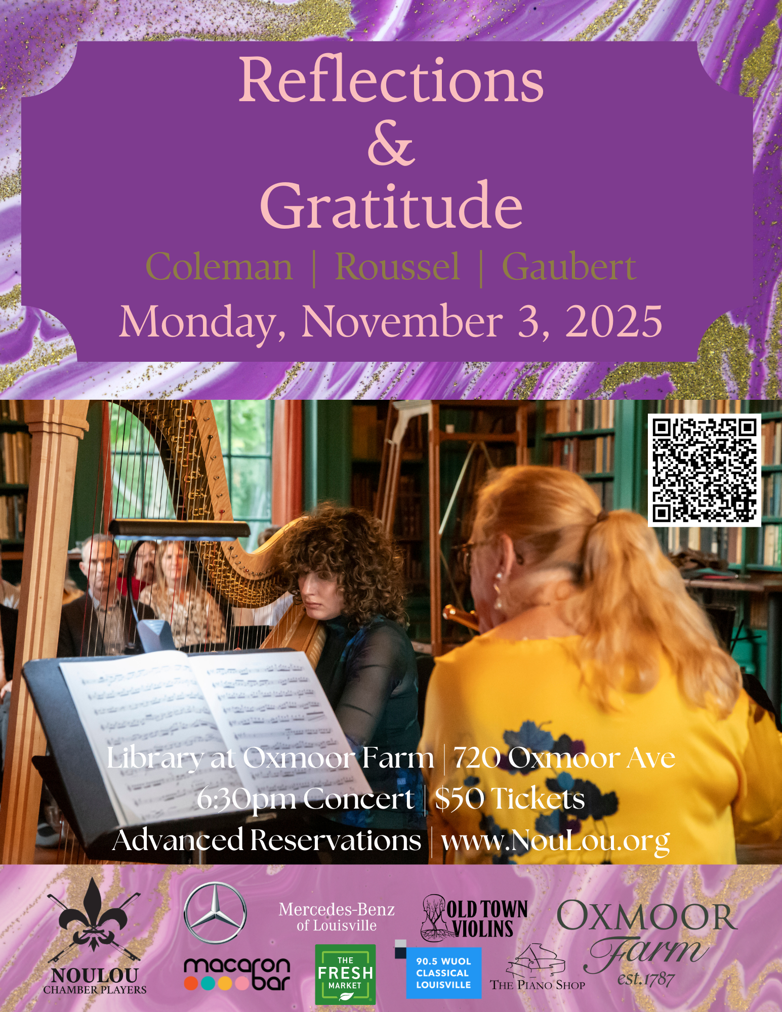 Join NouLou Chamber Players for Reflections & Gratitude, an inspiring evening of chamber music in the historic library at Oxmoor Farm, presented as part of our 10th Season celebration. Enjoy a pre-concert reception featuring handcrafted bourbon from Oxmoor Bourbon Company, then experience evocative works by Valerie Coleman, Philippe Gaubert, and Albert Roussel—featuring flute, harp, strings, piano, and mezzo-soprano—performed by Louisville’s premier chamber musicians. Immerse yourself in an evening where music and meaning come together in a truly unforgettable setting.