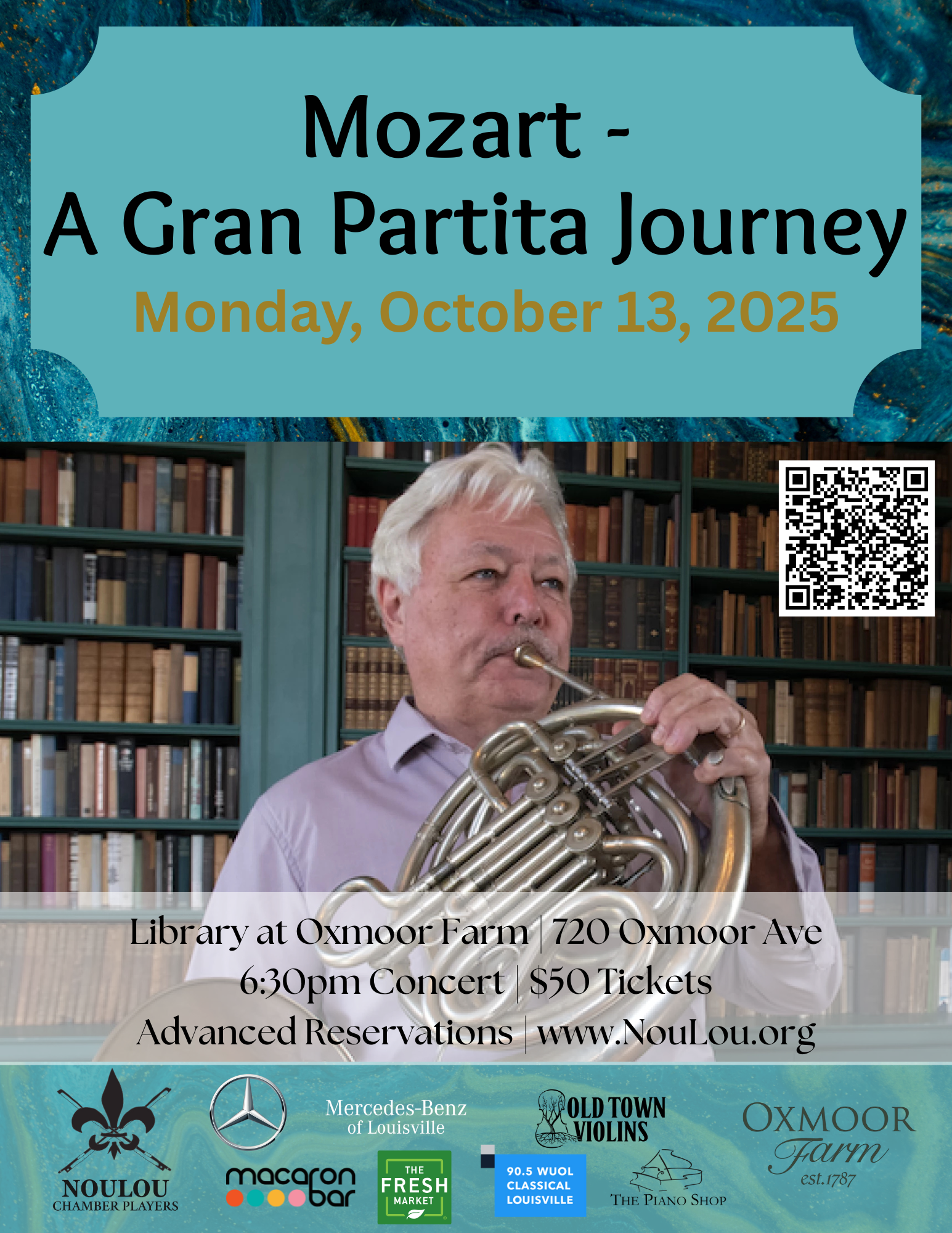 Celebrate the opening concert of NouLou Chamber Players’ 10th Anniversary Season with an unforgettable evening inside the historic library at Oxmoor Farm. Enjoy a pre-concert reception featuring handcrafted bourbon from Oxmoor Bourbon Company, followed by Mozart’s Gran Partita—a stunning serenade for oboes, clarinets, bassoons, and horns—conducted by Nicholas Finch. Join us as we kick off a milestone season with Louisville’s finest chamber musicians in one of the most beautiful settings in Kentucky!