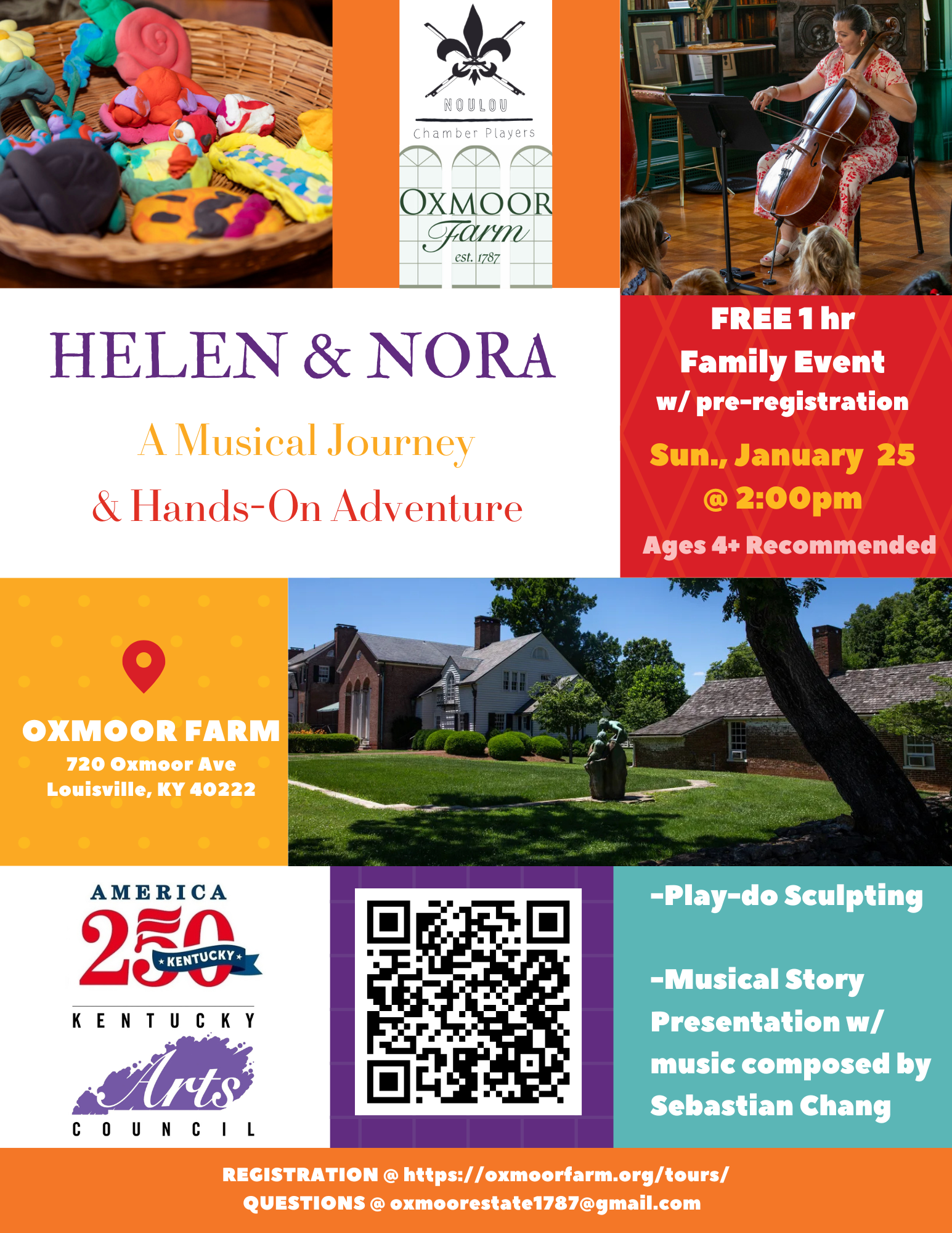 In partnership with Oxmoor Farm, we received funding from the Kentucky Arts Council in honor of America 250KY to present three more free to the public performances in 2026! Mark your calendars and bring your families for the first one on Sunday, January 25 at 2:00pm!